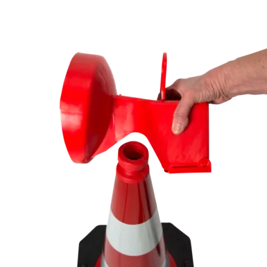 Durch einfaches Aufsetzen auf Ihren Leitkegel wird die Leuchte per Kontakt aktiviert und gibt ein gleichmässiges LED Blinklicht ab, welches heranfahrende Fahrzeuge auf die nahende Gefahrensituation aufmerksam macht.