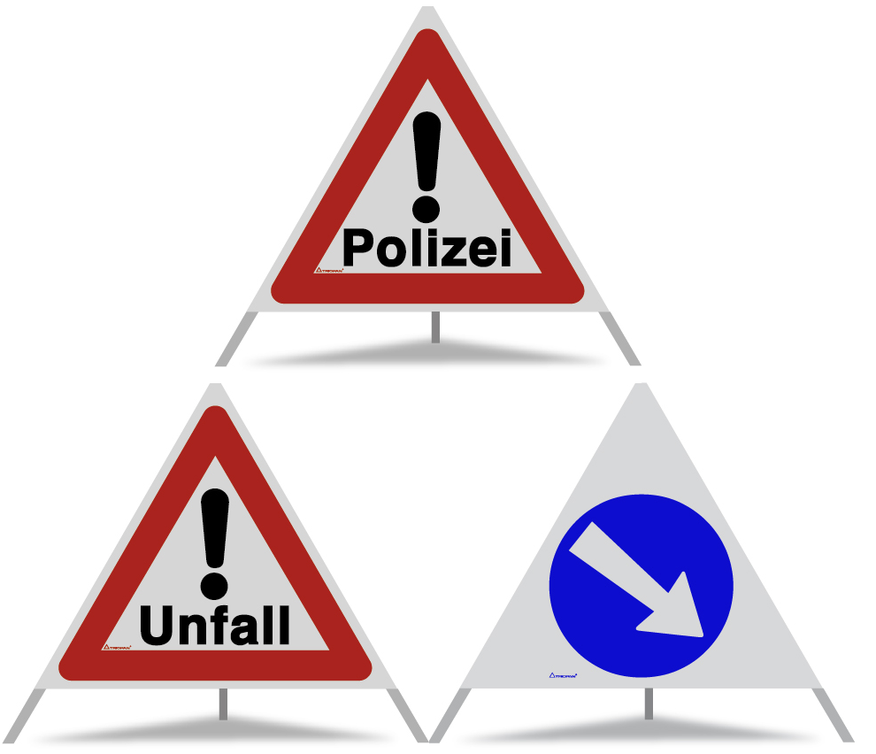 TRIOPAN Faltsignale sind für die kurzfristige Signalisationslösung von Gefahrenstellen. Robust, rasch montiert und dank eines Feder-Mechanismus faltbar und somit platzsparend zu verstauen. Jedes TRIOPAN Faltsignal wird in einem Schutz-Etui geliefert. Das TRIOPAN Faltsignal ist in verschiedenen Grössen erhältlich: 40 / 60 / 70 / 90 und 110 cm. TRIOPAN Faltsignale mit standardisierten Aufdrucken sind im Online-Shop verfügbar, individuelle Aufdrucke auf Anfrage.